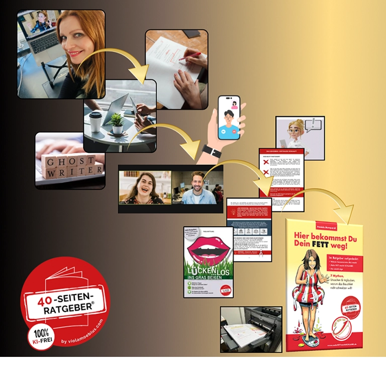 Es war im November 2014, als nach einem von Violas Seminaren eine Teilnehmerin auf sie zukam und nach „was zum Nachlesen” fragte: „…deine Tipps… nur ein paar Seiten… was in die Tasche passt...” Drei Monate später – im März 2015 – erschien der erste 40-Seiten-Ratgeber 2015. Ihre Mitbewerber titelten „Supermarktbroschüre” und lachten sie aus. Aber er bestand den Härtetest beim Publikum von AIDA. Der Markt liebte die 40-Seiten-Ratgeber® von Anfang an. Spätestens als der NDR anrief und Viola wegen ihres 40-Seiten-Ratgebers® als Expertin einlud, lachte keiner mehr.