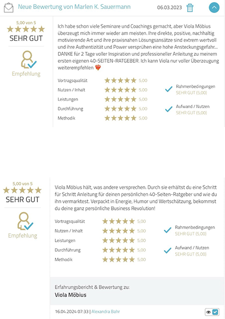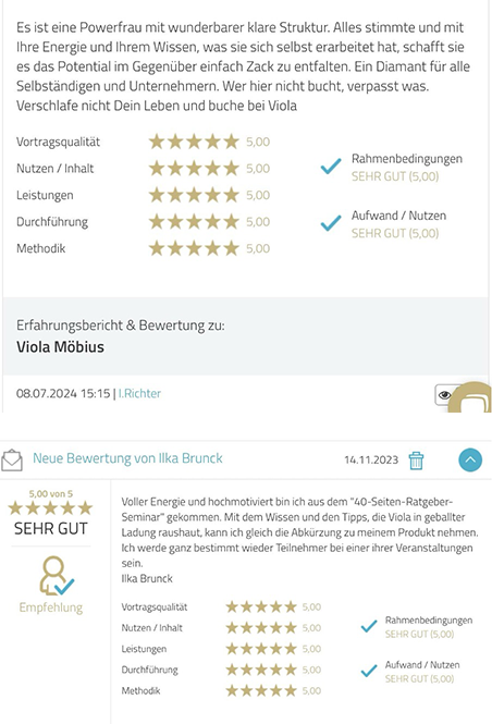 Mit Viola habe ich eine Expertin gefunden, die richtig Marketing lebt, die Inhalte leidenschaftlich und nachvollziehbar vermittelt und tolle Einstiegsangebote mit riesigen Mehrwert hat. Sie ist kurz davor, aufs nächste Level zu kommen, wo man sie dann wahrscheinlich nicht mehr so persönlich zu Gesicht bekommt im One-to-One Training, so wie ich im Rahmen des 40-Seiten-Ratgeber®-Seminars. Am Ende wünscht man sich, man könnte diese Inspirationsquelle am besten immer anzapfen, wenn man es gerade braucht.