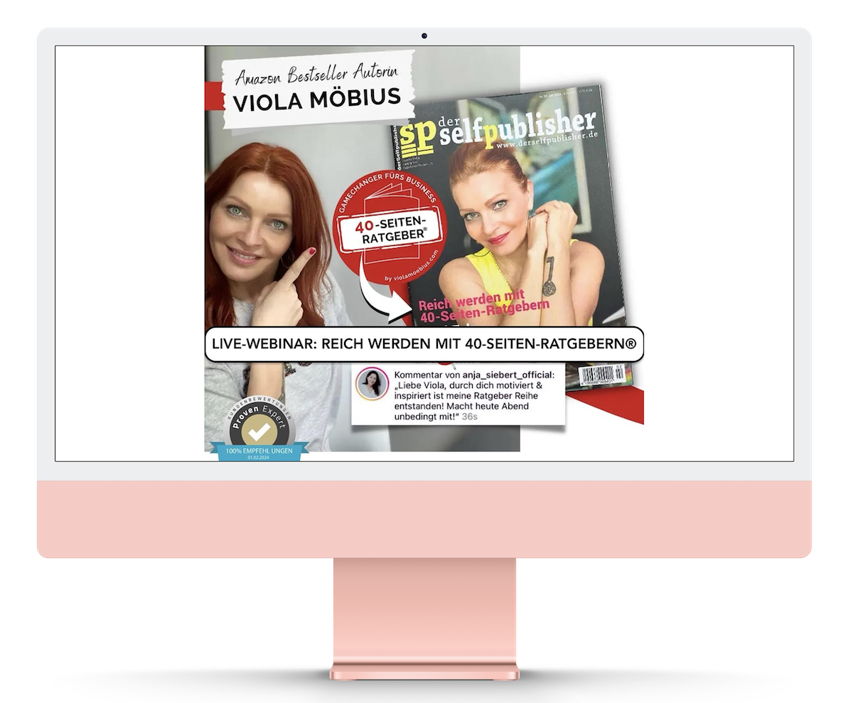 Es war Zeit, dieses einzigartige Erfolgskonzept für den Markt zu öffnen. Das tat Viola im März 2022 und lädt seitdem zum Live-Webinar “Reich werden mit 40-Seiten-Ratgebern®” ein. Das gesamte Erfolgskonzept erfahren Kunden dann bei „Business Revolution: Sichtbarkeit & Expertenstatus 40-Seiten-Ratgeber® - Das 2-Tage-Live-Online-Seminar“. Wer nicht selbst aktiv werden möchte, kann den 40-Seiten-Ratgeber® auch im „VIP Done4you“ Paket - natürlich im eigenen Stil - von Viola und ihrem Team komplett erstellen lassen.
