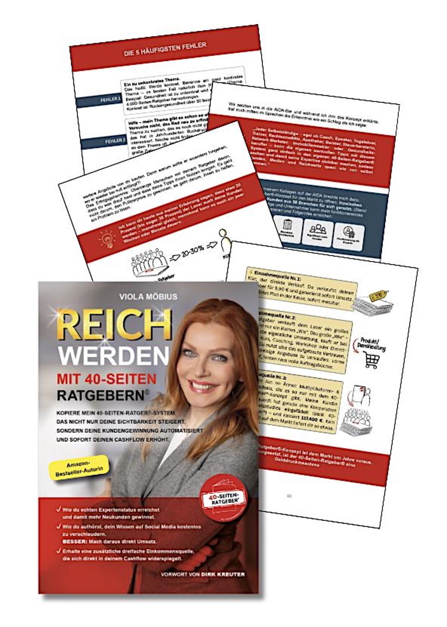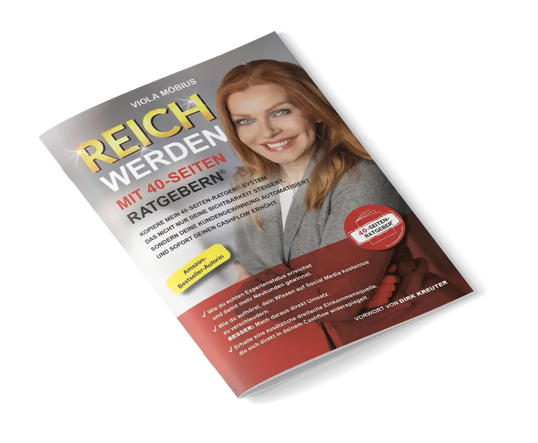 Ich habe mit den 40-Seiten-Ratgebern® nicht nur zehntausende von Menschen erreicht, sondern so viele Aufträge und Kunden bekommen, dazu eine zusätzliche dreifache Einnahmequelle, zig Auftritte in den Medien – also Sichtbarkeit, Reichweite, Expertenstatus – und Produktverkäufe. Denn das ist der 40-Seiten-Ratgeber®: ein 24-h-Verkäufer für deine Produkte und Dienstleistungen.