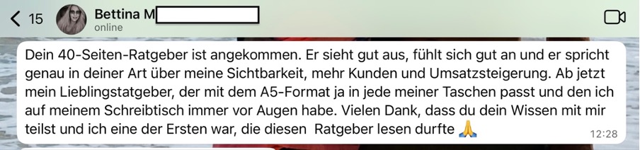 Darüber hinaus ist der 40-Seiten-Ratgeber® ist ein cleveres Marketingtool, durch das ich mehr in meinem Business erreicht habe, als mit all dem, was ich zuvor unternommen habe. Und das ist alles echt – schau gerne bei Google.