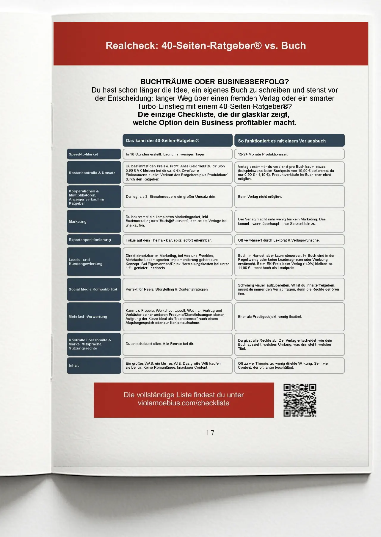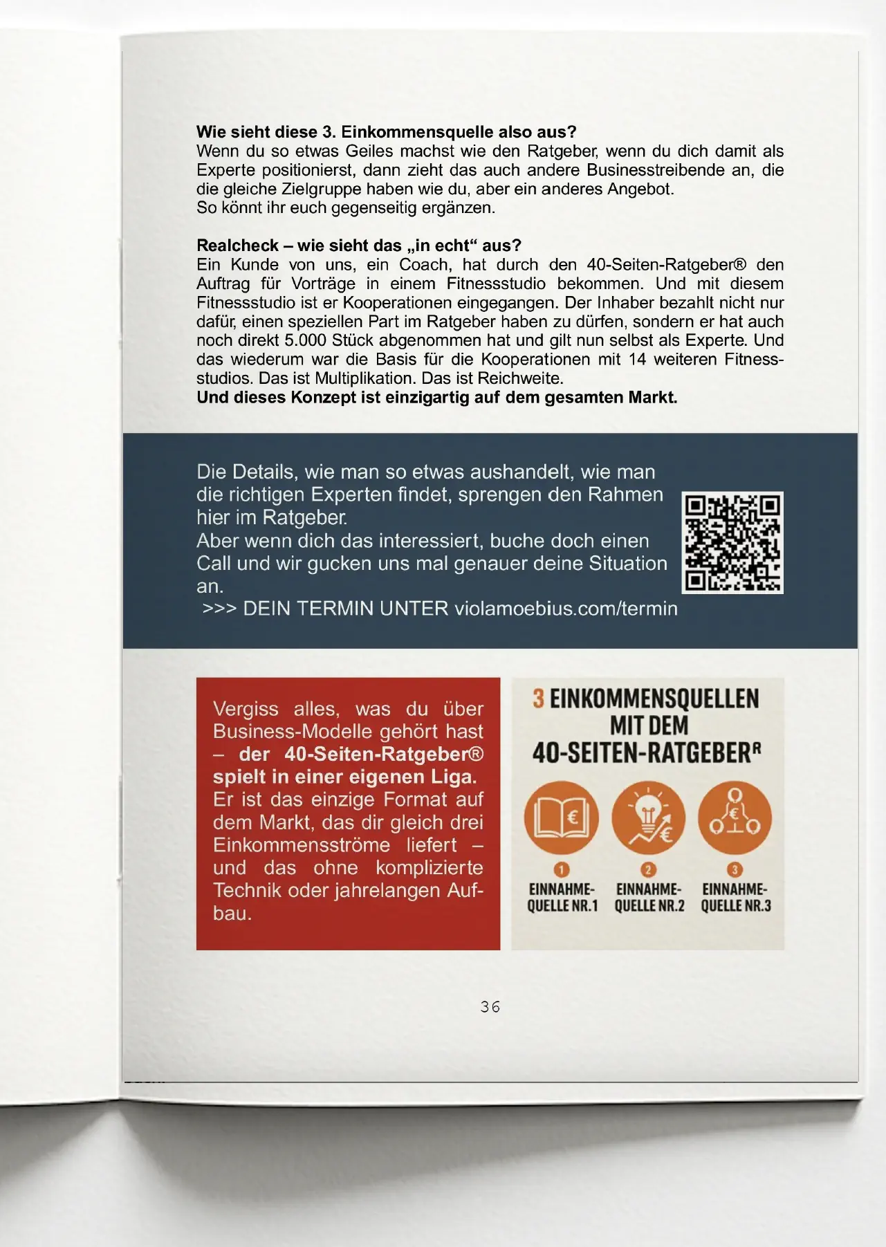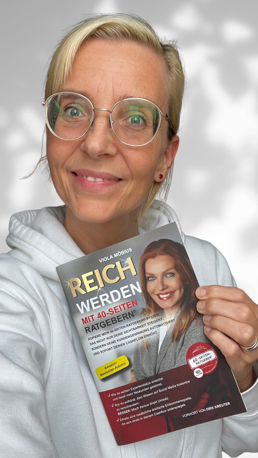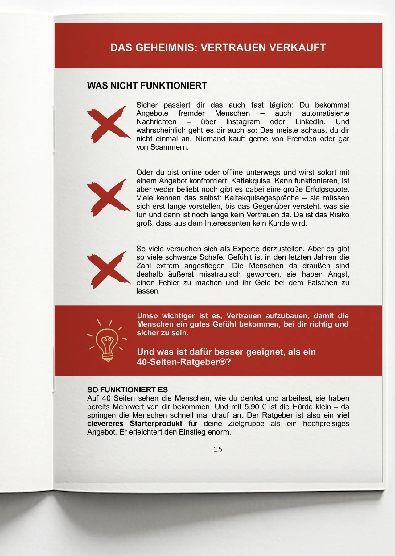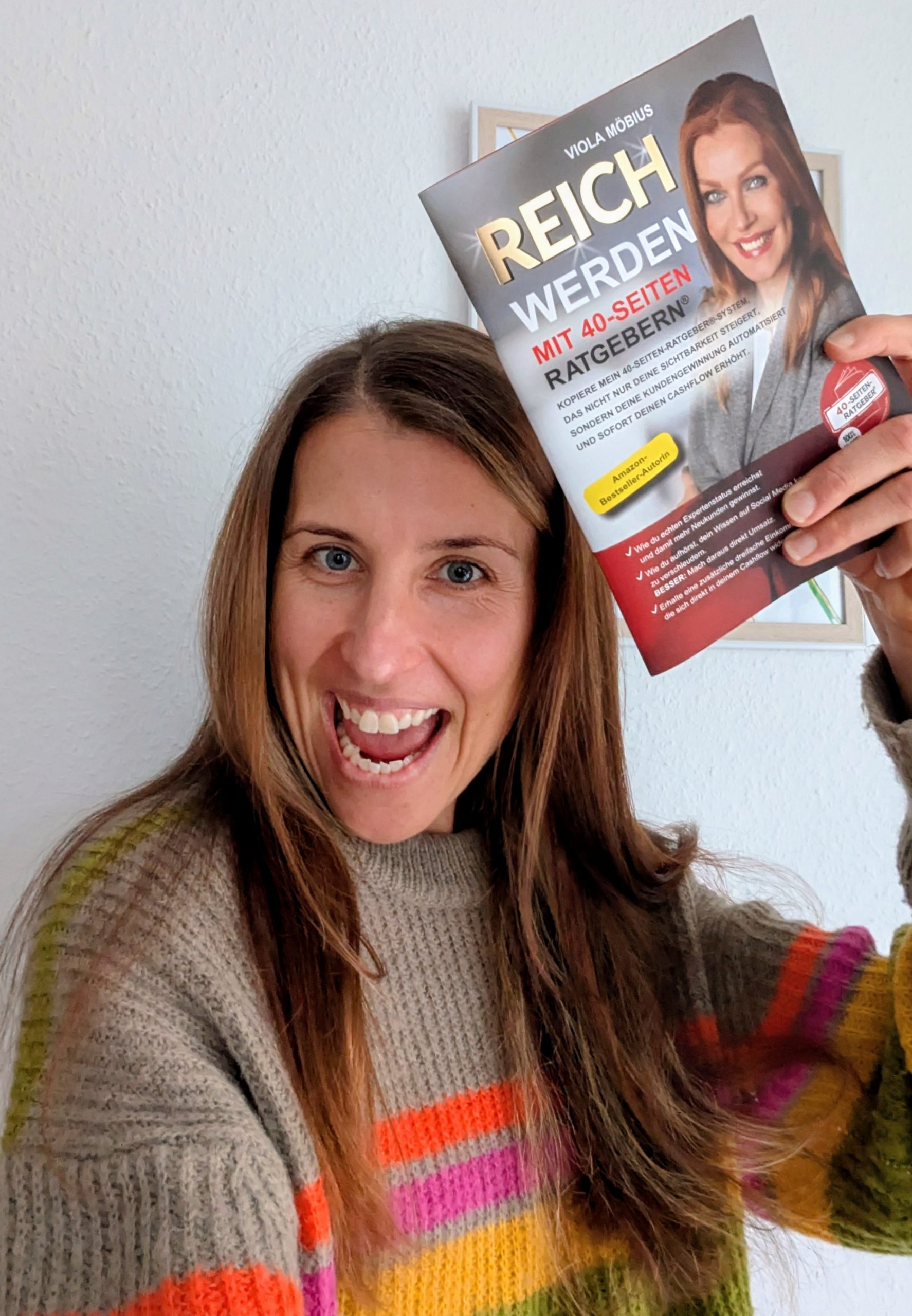 Ich habe mit den 40-Seiten-Ratgebern® nicht nur zehntausende von Menschen erreicht, sondern so viele Aufträge und Kunden bekommen, dazu eine zusätzliche dreifache Einnahmequelle, zig Auftritte in den Medien – also Sichtbarkeit, Reichweite, Expertenstatus – und Produktverkäufe. Denn das ist der 40-Seiten-Ratgeber®: ein 24-h-Verkäufer für deine Produkte und Dienstleistungen.