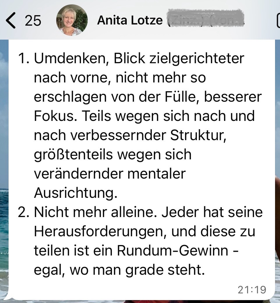 Zu viele stehen allein da und bei vielen ist es der größte Wunsch, persönliche Begleitung zu haben, direktes Feedback zu bekommen und echte Hilfe. Nicht im Online-Kurs, sondern live, direkt, echt, persönlich.